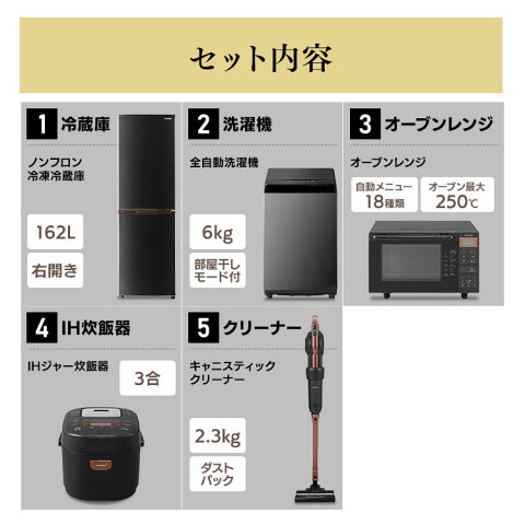 ■セット内容・ノンフロン冷凍冷蔵庫162L IRSE-H16A・全自動洗濯機 6kg IAW-T603・オーブンレンジ 18L BLMO-F1801-B・IHジャー炊飯器 3合 BLRC-IK30-B ・キャニスティッククリーナー IC-CSP5≪ノンフロン冷凍冷蔵庫162L IRSE-H16A≫●種類:ノンフロン冷凍冷蔵庫●冷媒:R600a●ドア数:2●商品サイズ(cm):幅約47.4×奥行約53.5×高さ約149.6●質量:約40kg●定格電圧(定格周波数):AC100V(50Hz/60Hz)●定格内容積※1:162L(冷蔵室:100L/冷凍庫:62L)●冷凍室の性能※2記号:フォースター冷凍負荷温度(食品温度):-18℃以下冷凍食品の保存期間の目安:約3か月●定格入力(50Hz/60Hz):68/74W●電熱装置の入力:6W●ドア開閉方向:右●電源コード長さ:1.8m※1定格内容積は、日本工業規格(JISC9801:2015)にもとづき、食品収納スペースと冷気循環スペースを含んでいます。