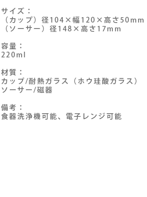 サイズ: (カップ)径104×幅120×高さ50mm (ソーサー)径148×高さ17mm 容量: 220ml 材質: カップ/耐熱ガラス(ホウ珪酸ガラス) ソーサー/磁器 備考: 食器洗浄機可能、電子レンジ可能